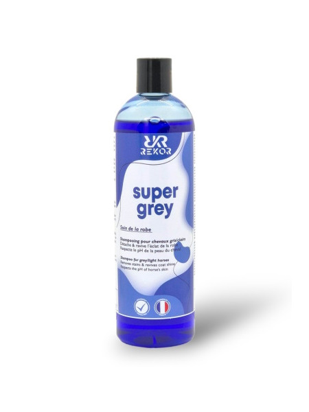 Rekor Super Grey é um champô roxo suave com pH neutro, especialmente formulado para cavalos de pelagem cinzenta ou clara. Graças aos seus pigmentos violetas, este champô elimina eficazmente manchas difíceis como urina, terra ou erva, ao mesmo tempo que realça o brilho natural do pêlo. A sua fórmula respeitosa com as peles sensíveis permite uma limpeza frequente, sem agredir ou ressecar a pele do animal.