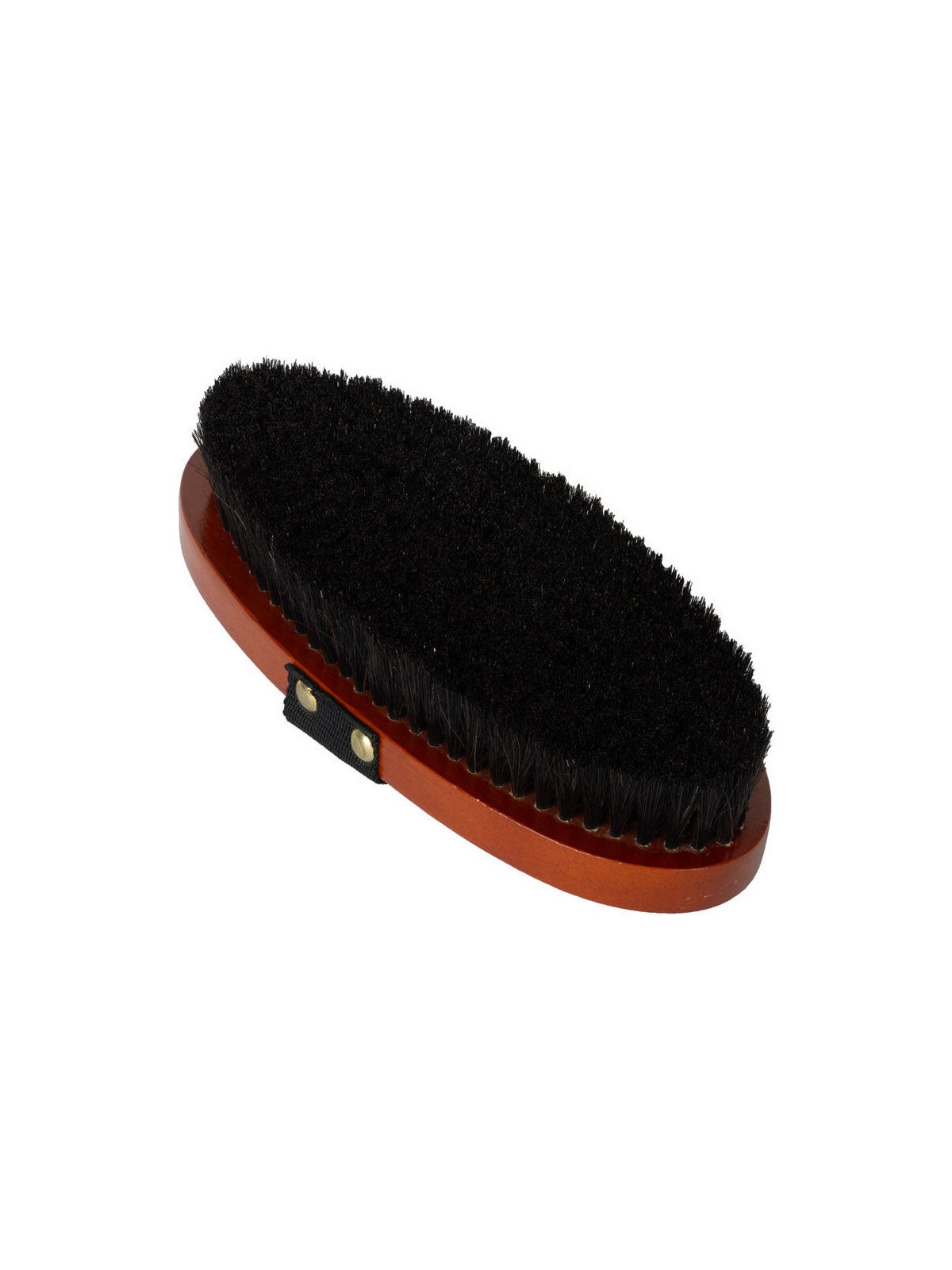 Esta bruça da marca B Vertigo é uma ferramenta de higiene elegante e funcional para cavalos. Possui um cabo de madeira de alta qualidade, cujo formato permite um manuseamento confortável. As cerdas são suficientemente firmes para remover eficientemente a sujidade e o pó da pelagem do cavalo, mas suaves para a pele do animal. Uma característica distintiva é a tira preta com o nome da marca impresso, que se estende sobre a escova, garantindo uma aderência segura durante a utilização. O acabamento cuidado e o design atraente fazem desta bruça um acessório indispensável para a higiene diária dos cavalos.