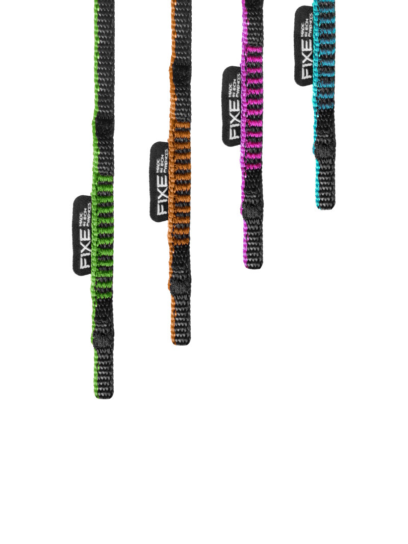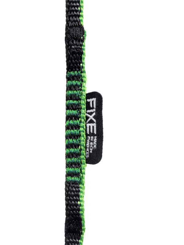 Fita cosida. A costura da fita, tanto nas extremidades como nas laterais, é reforçada para evitar que esta se prenda aos objetos durante as manobras em ancoragens, com mosquetões, etc. O logótipo característico da Fixe é cosido na lateral da fita para evitar atrito durante as manobras, e as bordas da etiqueta são arredondadas. Esta fita é estreita, com apenas 8 milímetros de largura, reduzindo o peso total do seu equipamento.