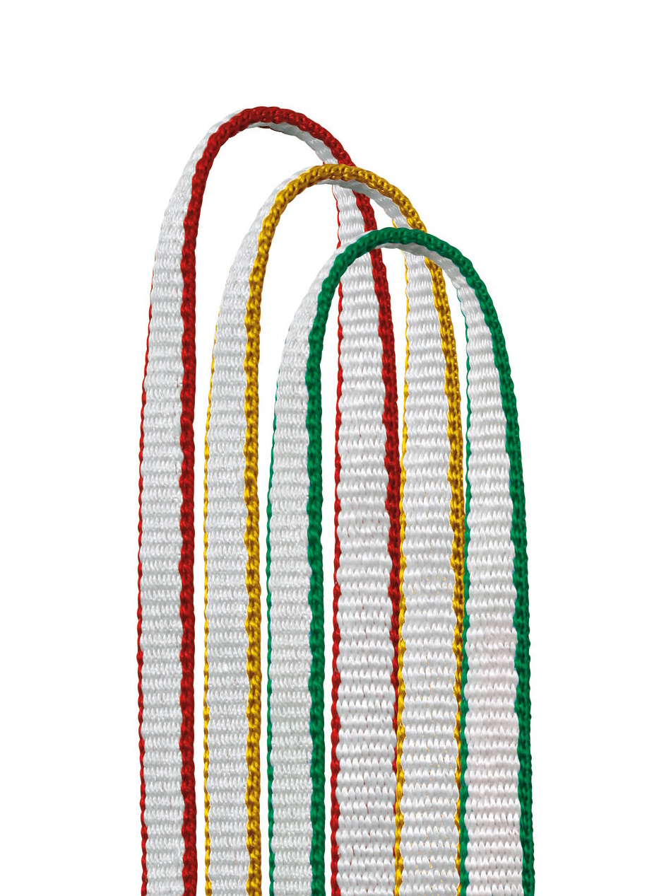 Uma alternativa mais leve às cintas de nylon, estas cintas de HMPE (polietileno de alto módulo) e nylon possuem um código de cores para facilitar a identificação do comprimento.