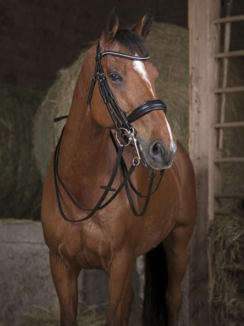 Rédeas de freio em pele de búfalo com ganchos e costura preta.